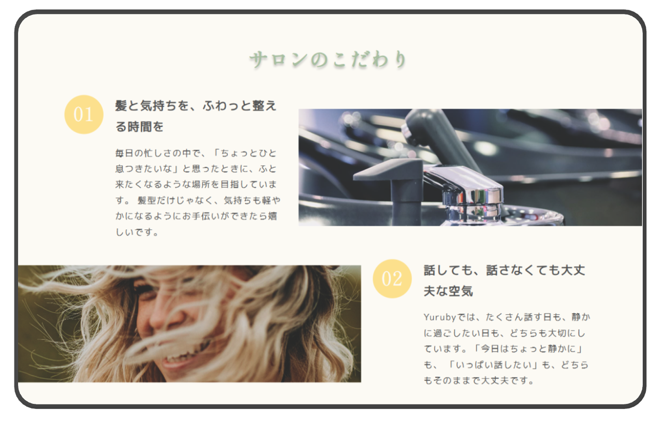 デザイン白と木を基調にした、ナチュラルでやさしい雰囲気の美容院をイメージして制作した架空サイトです。「髪も心もととのう、いつもの場所」をコンセプトに、余白や色づかいを大切にしながら、ゆったりと心地よく感じられるデザインを意識しました。